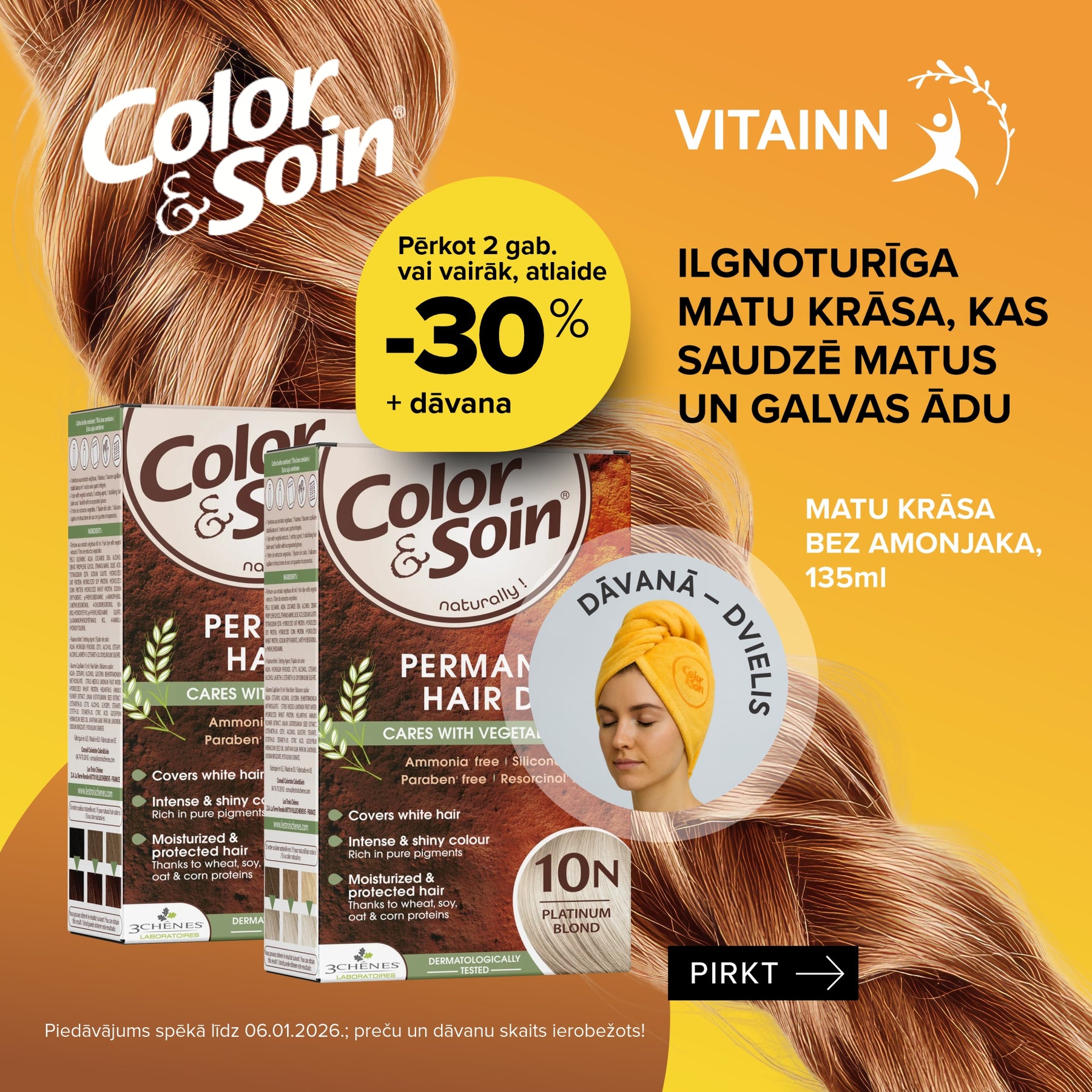 COLOR & SOIN bez amonjaka - maiga, ilgstošas iedarbības matu krāsa ar augu ekstraktiem. Tas ir dermatoloģiski pārbaudīts, maigs produkts, kas paredzēts ērtai lietošanai. Piemērots dažādiem matu tipiem, tostarp vājiem, sausiem vai lūšanai pakļautiem matiem, kā arī bieži veidotiem vai ķīmiski apstrādātiem matiem. Formula ir sabalansēta, lai tā būtu piemērota lietotājiem ar jutīgu ādu. 8