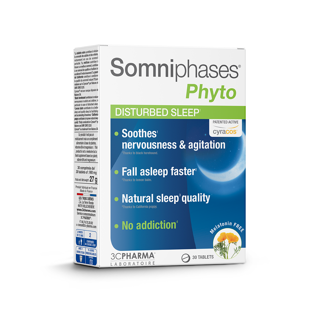 3C PHARMA Somniphases Phyto – dabīgs komplekss miegam un relaksācijai. Patentēts Cyracos® citronmelisas ekstrakts, Kalifornijas magone, lavandas eļļa, magnijs un B6 vitamīns var palīdzēt uzturēt kvalitatīvu miegu, relaksāciju un mazināt nogurumu. Neizraisa atkarību, piemērots lietošanai no 12 gadu vecuma.