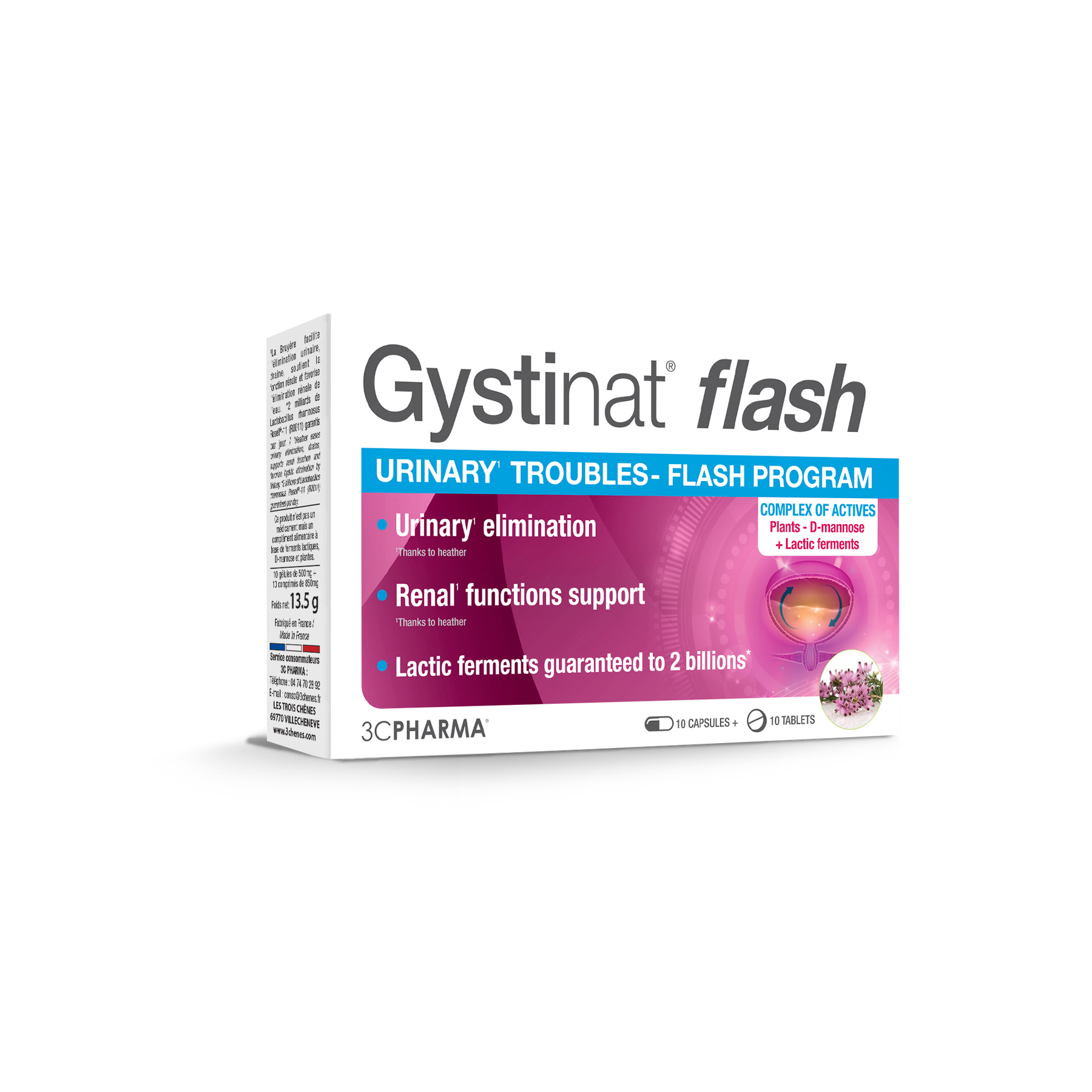 3C PHARMA Gystinat Flash ir dabīgs uztura bagātinātājs urīnceļu sistēmai. Sastāvā esošās labās baktērijas palīdz uzturēt zarnu un intīmās mikrobiotas līdzsvaru. Viršu ekstrakts, D-mannoze un dzērveņu ekstrakts veicina normālas nieru un urīnceļu darbības uzturēšanu. Piemērots bērniem no 6 gadu vecuma, kā arī grūtniecības un barošanas ar krūti laikā.