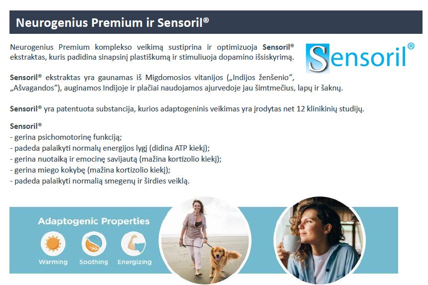 Neurogenius Premium kompleksa darbību pastiprina un optimizē Sensoril® ekstrakts, kas palielina sinaptisko plastiskumu un stimulē dopamīna izdalīšanos.