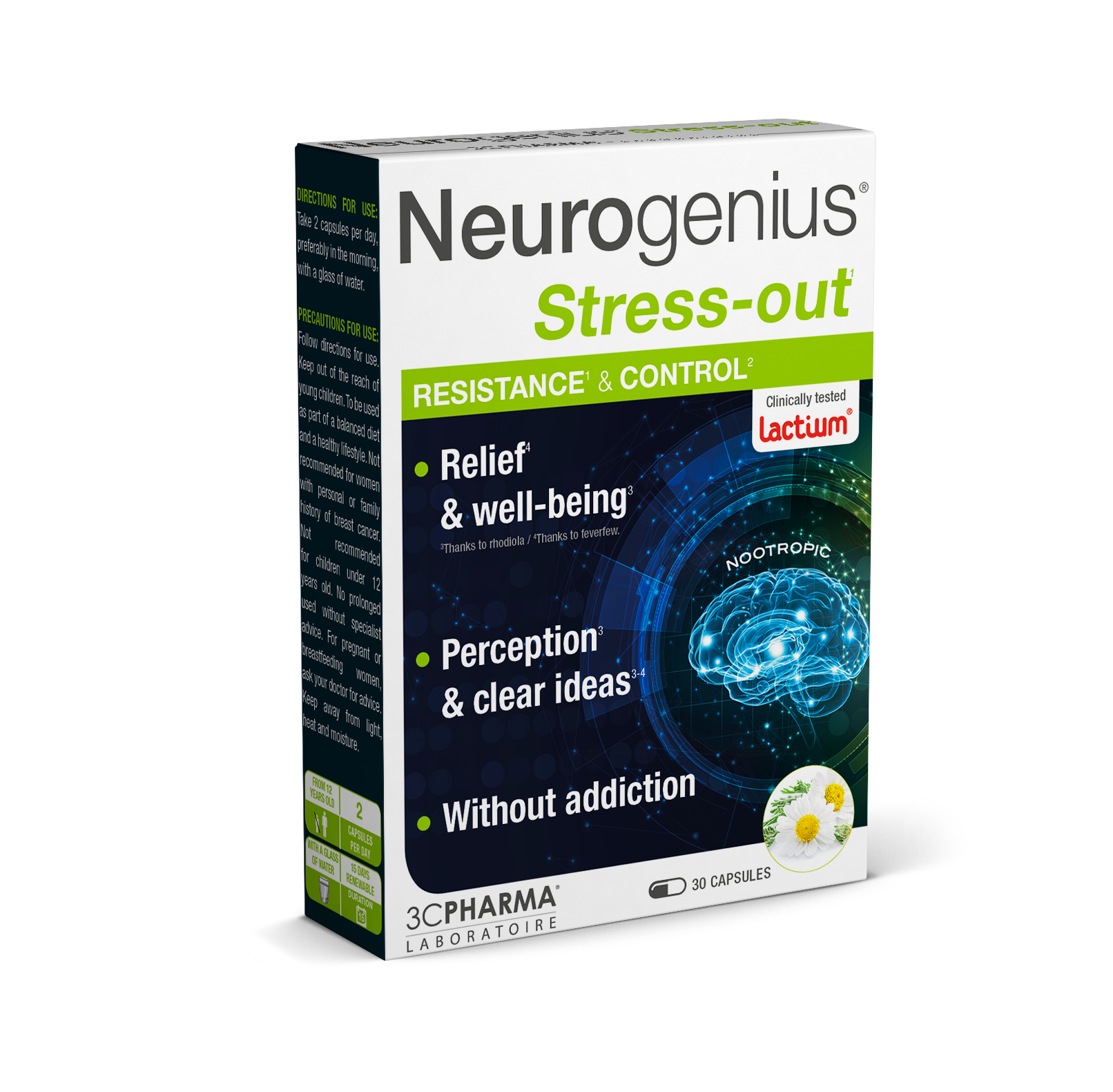 3C PHARMA Neurogenius Stress-Out ir sabalansēta mikroelementu, vitamīnu un augu ekstraktu kombinācija trauksmes un stresa mazināšanai, koncentrēšanās spēju uzlabošanai un ķermeņa atbalstam psihoemocionālas spriedzes vai enerģijas trūkuma laikā. Sastāvā esošais patentētais Lactium® var palīdzēt mazināt stresa izraisītu psihoemocionālu spriedzi, trauksmi un bezmiegu. Savukārt bazilika un rožainās radiolas ekstrakti palīdz uzturēt normālu darbspēju un emocionālo līdzsvaru. Šī kombinācija var būt noderīga arī atmiņas uzlabošanai.